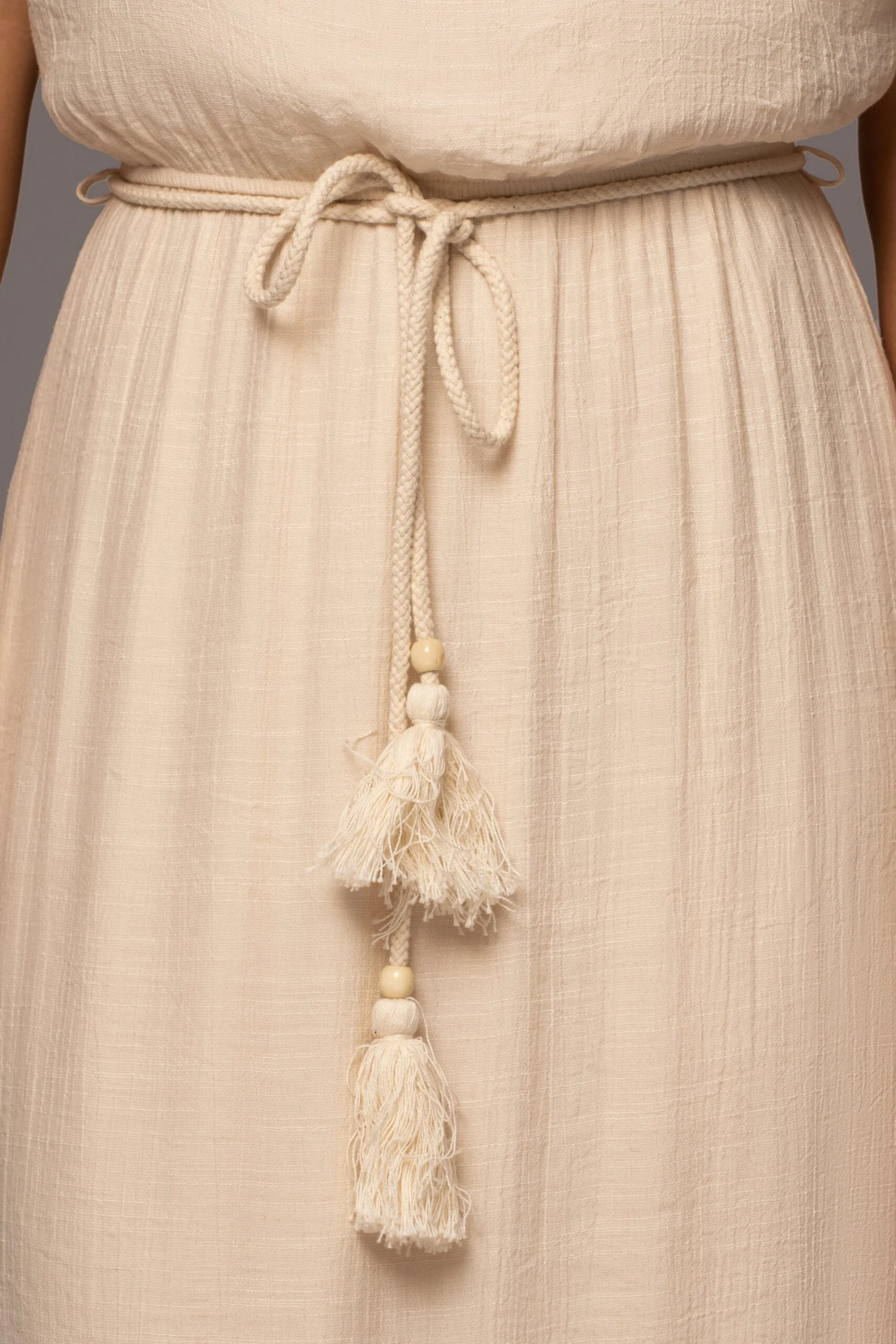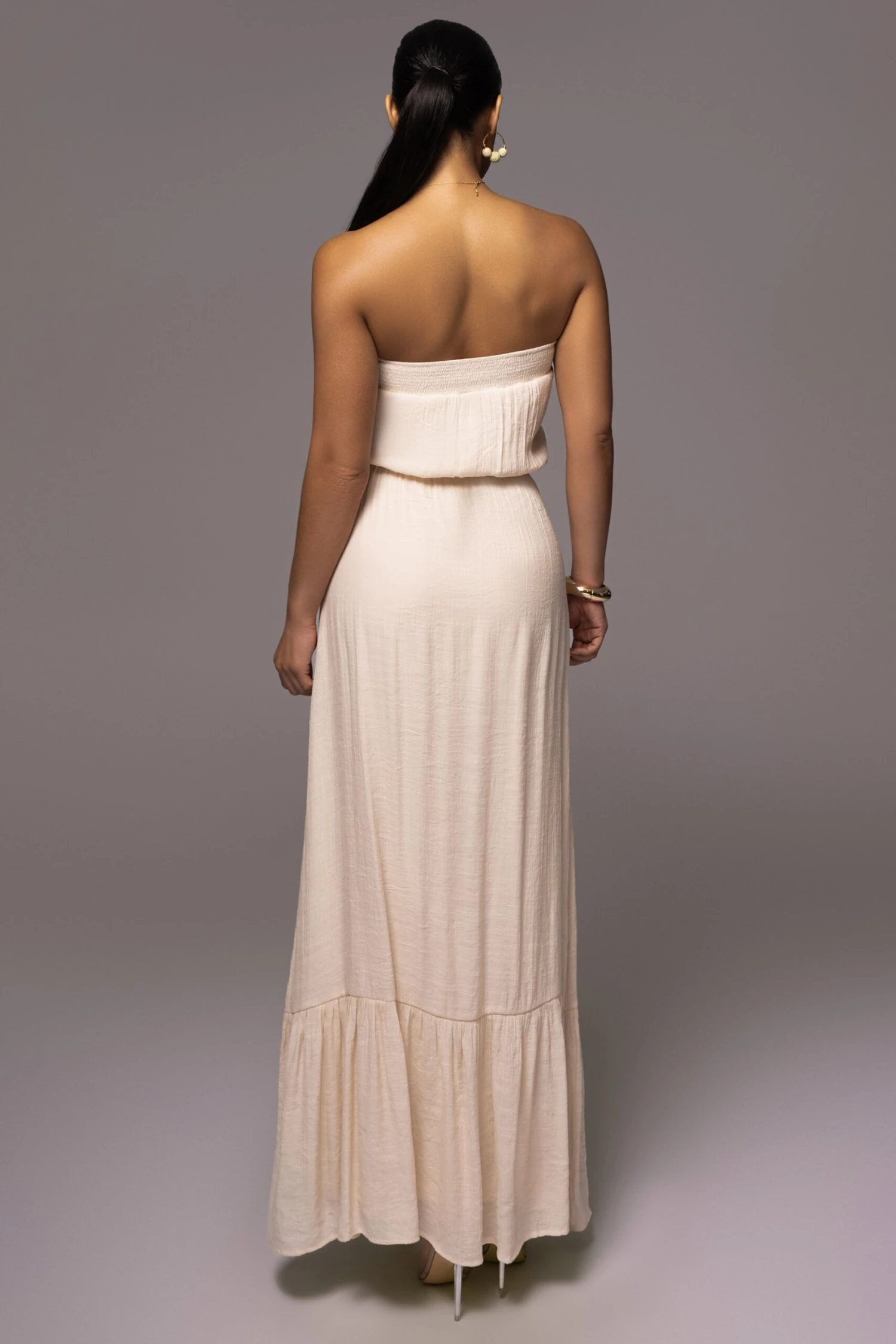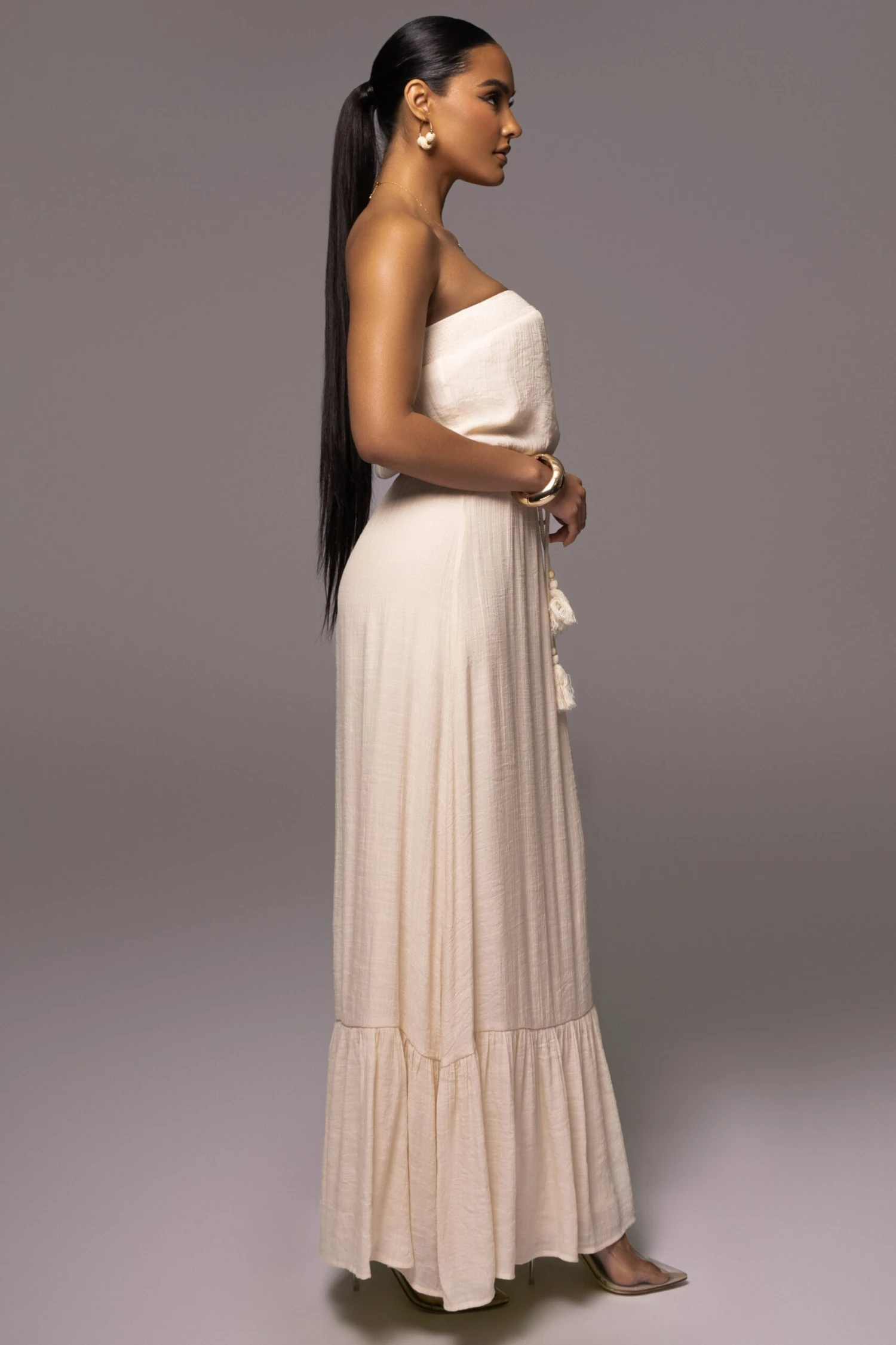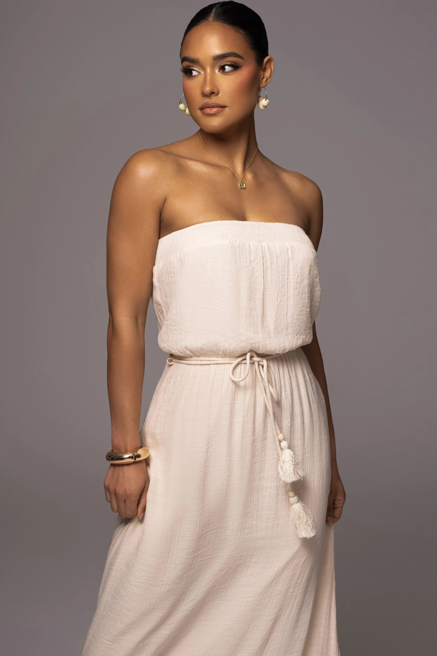 Introducing our new Beige Del Sol Linen Maxi Dress. Crafted in a linen blend, our latest maxi dress features a strapless neckline with a ruffle trim hem and an adjustable drawstring at the waist detailing tassel trims. Stretchy.