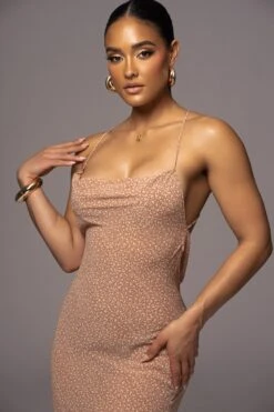 Our new Beige Good Luck Charm Maxi Dress brings a dreamy feel to Summer days in a fitted maxi design featuring a subtle floral print with adjustable back straps, a side zipper closure, and low cowl back. No stretch. Single lined.