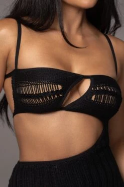 City meets coastal style in our new Black Coastal Escape Dress. Crafted in a crochet knit fabric, this sleek midi dress features a square neckline with adjustable shoulder straps and two back straps with adjustable fastening. A cut at the chest and waist adds a touch of allure. Double lined. Stretchy.