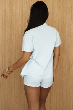 Greet hot summer days in style with our Blue Halle Two Piece Short Set! The resort-ready short set features a collar neck top with short sleeves and a button-front closure. The matching shorts feature a relaxed fit with drawstring waistband. Stretchy. Sold as set.