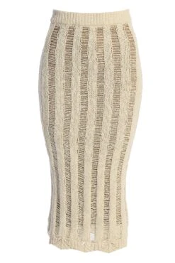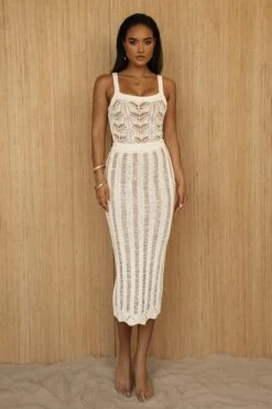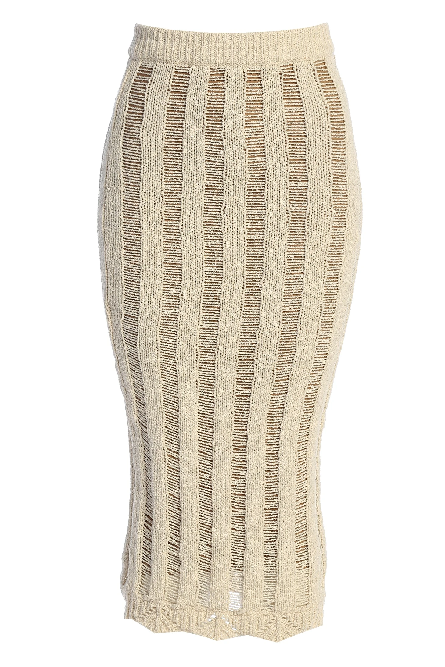 Luxuriate under the sun with our Buttercream Good Form Midi Skirt. This pencil silhouette midi skirt is featured in a distressed crochet fabric with an elastic waistband and beige lining interior. Stretchy.