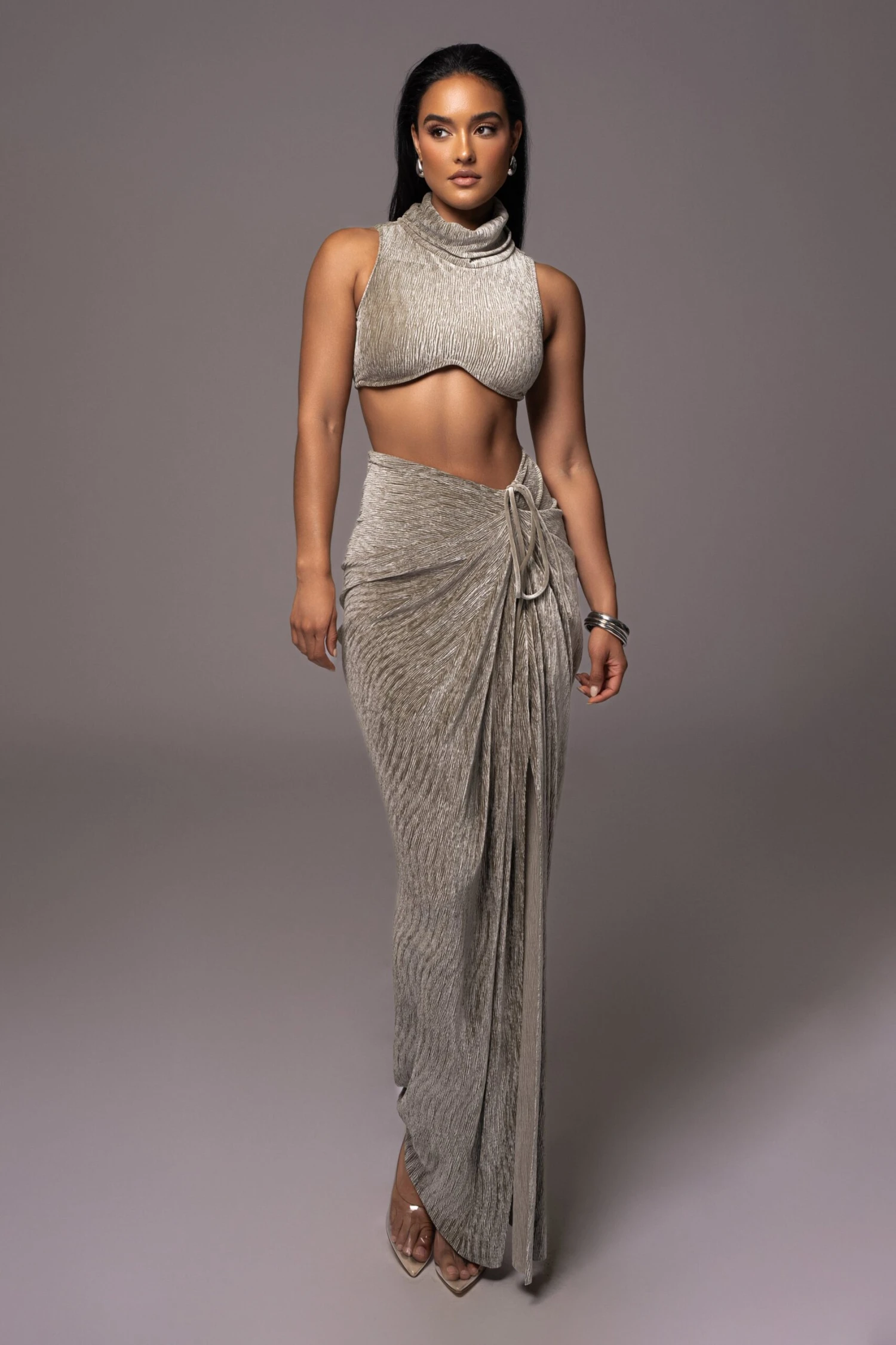 Our Grey Chosen One Velvet Skirt Set makes styling your next night out effortless! Crinkled velvet fabric shapes this romantic two-piece set featuring a sleeveless crop top with a turtleneck and an under-bust cut with structured wiring. The matching skirt is cut with a high waist and details a beautiful drape and side slit. Single-lined with stretch. Sold as set.