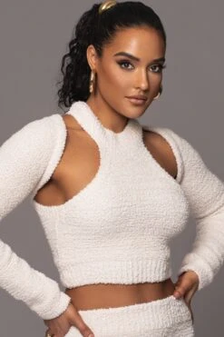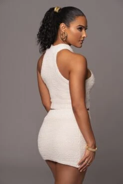 Stand out in contemporary style with our Ivory Cross Paths Plush Three-Piece Set. This charming three-piece skirt sets an effortless one-and-done style no matter the season, featuring a halter-style cropped top, a matching high-rise skirt, and a sweet shrug cardigan. Stretchy. Sold as set.
