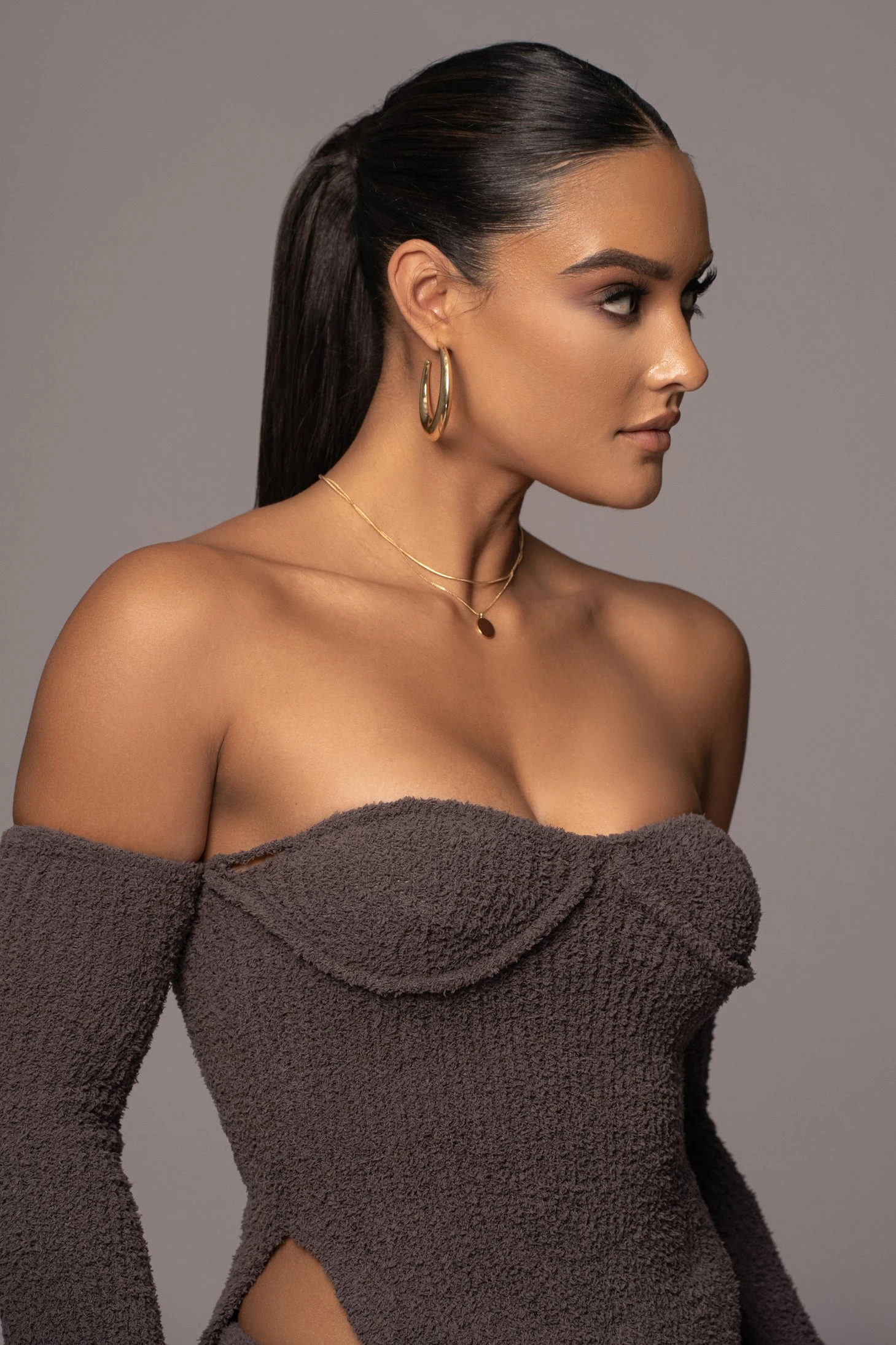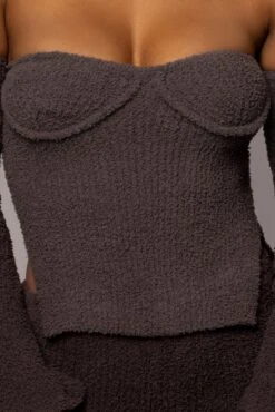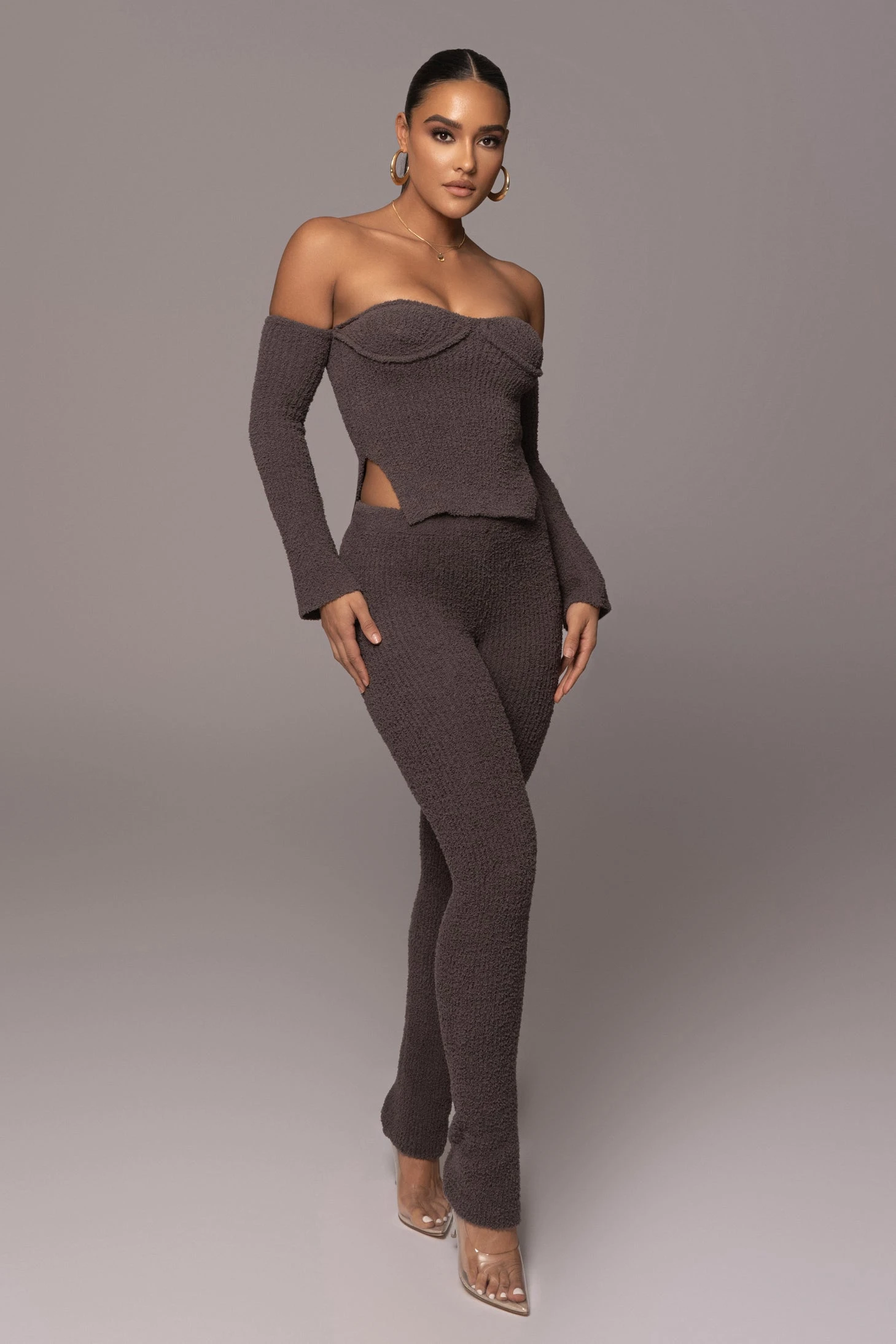 Sleek yet so comfy in our Midnight Grey Off The Record Plush Set. This ultra-soft pant set is crafted in a ribbed plush fabrication and features an off-shoulder top with long sleeves and split side hems. The matching pants are topped with an elastic waistband and fitted hems. Stretchy. Sold as set.