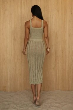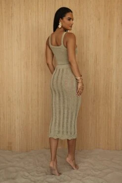 Luxuriate under the sun with our Moss Good Form Midi Skirt. This pencil silhouette midi skirt is featured in a distressed crochet fabric with an elastic waistband and beige lining interior. Pair with our