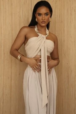 Introducing the new Natural Take A Seat Halter Top! A must have summer staple that takes your look from day to night effortlessly. This vacation ready halter top offers eye-catching detail with a tortoiseshell embellished neckline and stunning front drape design. Crafted in a soft and breathable fabric for fresh comfort. Pair with our