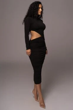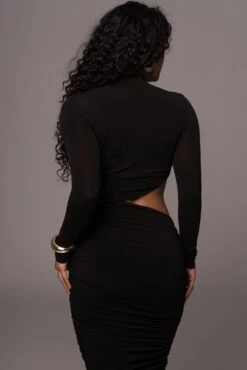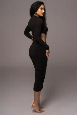 Introducing our Noir Clear Skies Mock Neck Dress – an embodiment of refined elegance. This versatile midi dress features a mock neckline, long sleeves arms, and a stylish asymmetrical cutout located towards the right waist. Flattering ruching throughout gracefully elevates this piece with texture. Stretchy. Double-lined.