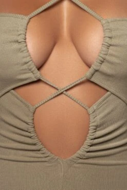 Cut to perfection in our new Olive Mesmerize Midi Dress. Dress to stun in this ribbed long sleeve dress featuring a bold cutout with crisscross design and adjustable back ties that connect at the back for a stylish finish. Double lined. Stretchy.