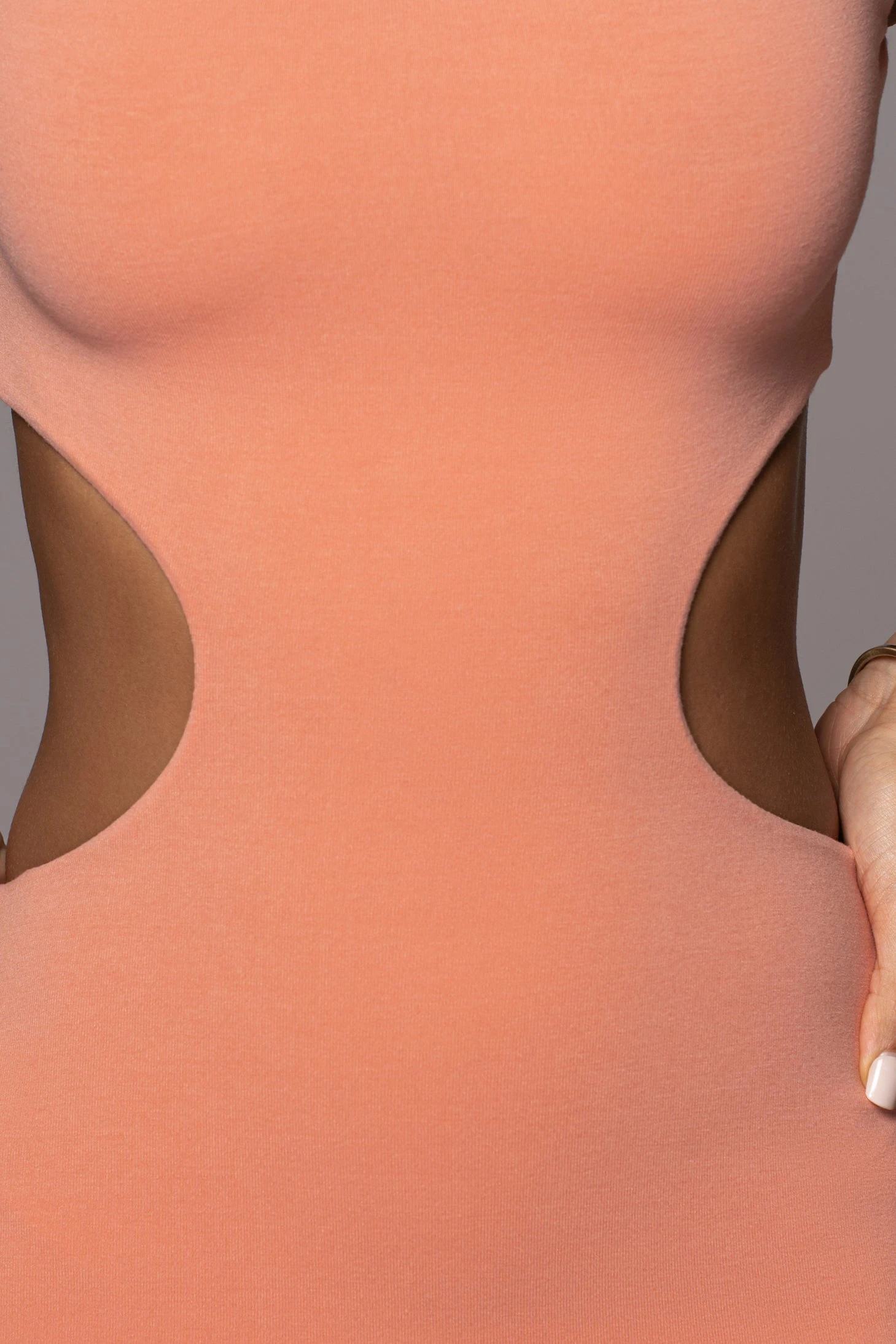 Forever mesmerizing in our Peach Til Sunrise Midi Dress. This beautiful midi dress highlights a mock neckline with sleeveless shoulders and a seductive cutout at the waist. Double lined. Stretchy.