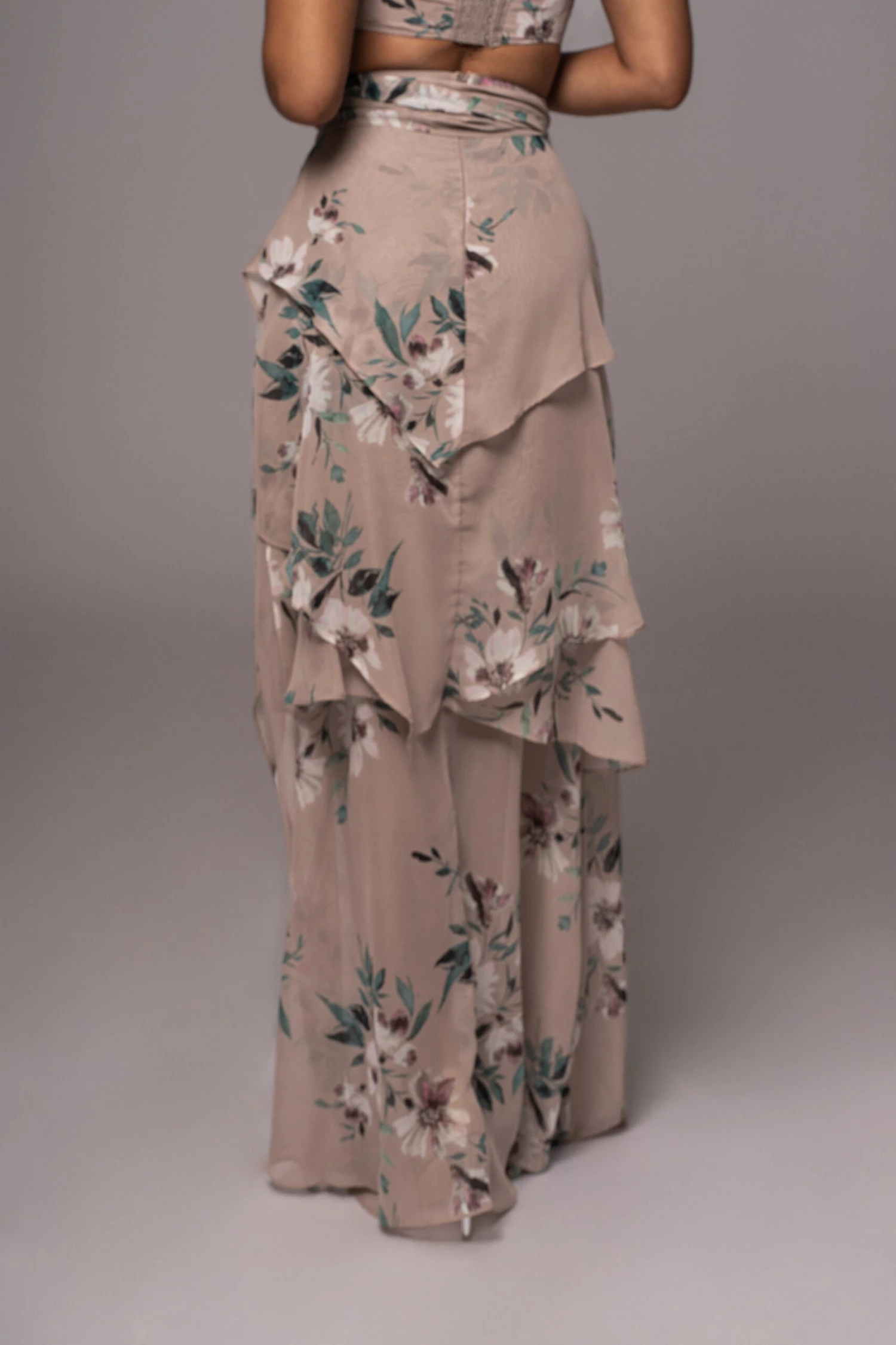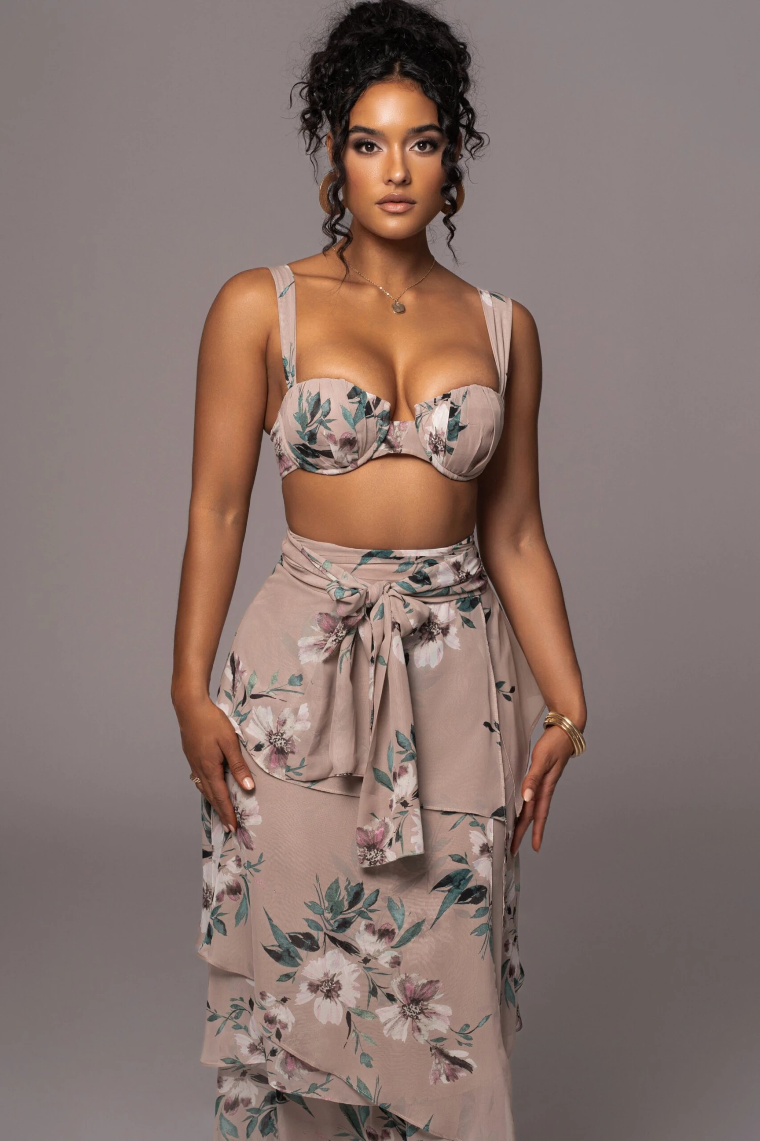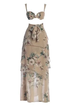 Our Purple Floral Printed Love Two-Piece Set sets a romantic tone all summer in a lovely floral pattern. Featuring a pleated bra top with padded cups, adjustable shoulder straps, and hook and eye closures. The matching skirt features a tie waistband and ruffled tiers cascading down to the maxi hem. Crafted in breathable chiffon material keeping your style on a fresh note all season. Single lined. Sold as set. Minimal stretch.Â