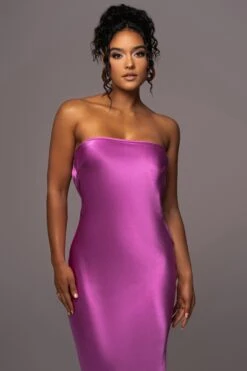 Radiate on all angles with our new Purple Irina Satin Maxi Dress. This beautiful maxi design features a strapless neckline with a stylish tie back closure and a flattering silhouette that falls effortlessly around your curves. Crafted in a smooth satin fabric for ultimate shine and elegance. No stretch.