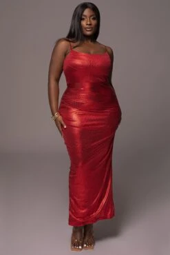 Have a luxe moment all night long with our Red Rubi Cowl Neck Cocktail Dress. This one of a kind maxi dress features an elegant cowl neck with adjustable camisole straps, slit ruching throughout, and a low center slit at the back. Crafted in a mix of shiny and scaly fabric for a shimmering visual. Gold tone back zipper for closure. Stretchy.