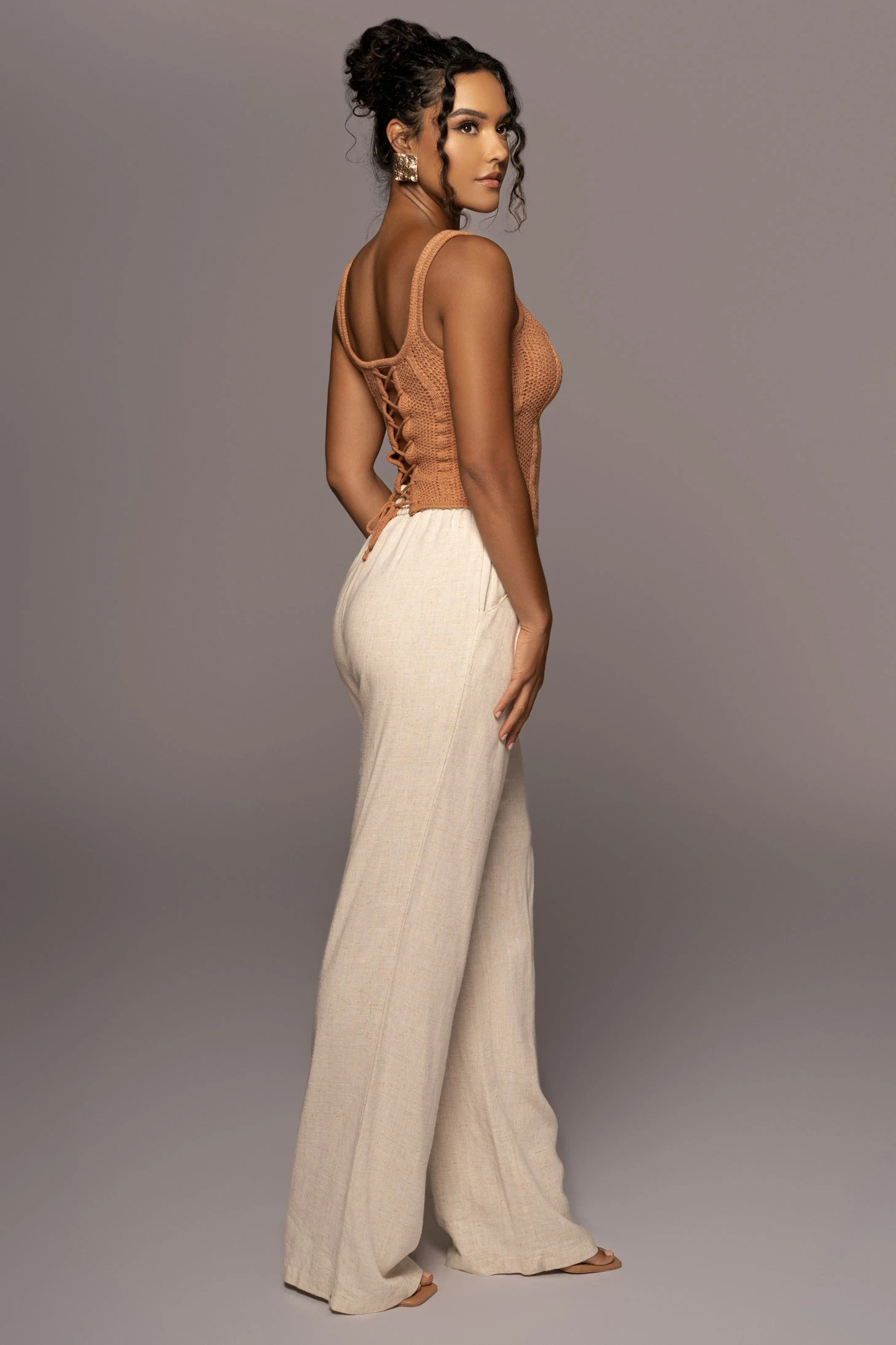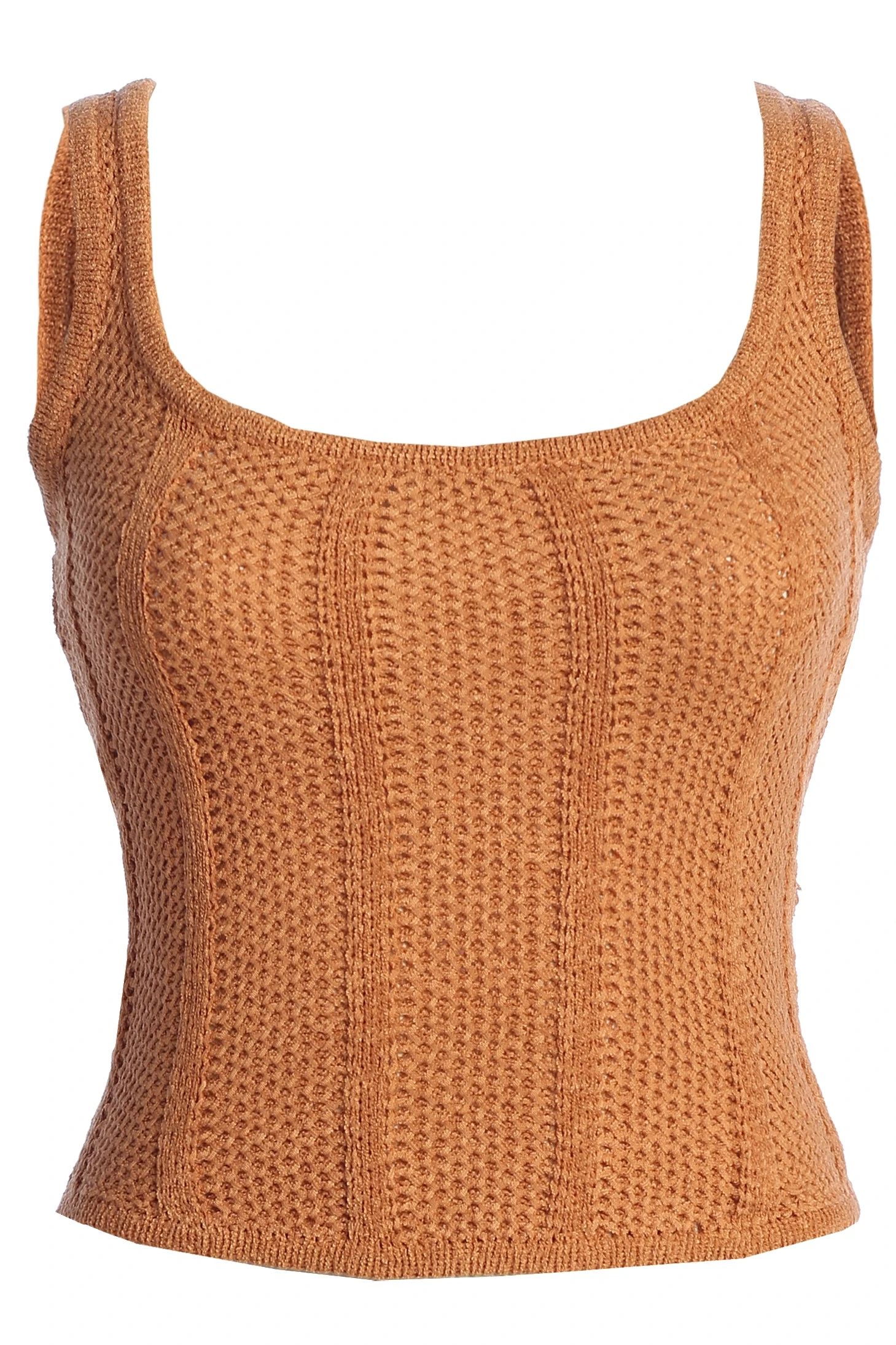 EXCLUSIVELY DESIGNED BY US FOR YOU. Set a coastal vibe with our RUST SHORE THING CROCHET TOP! This crochet knit top features a squared neckline with tank shoulders straps, a ribbed bodice, and back lace up ties. Pair with our