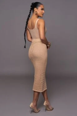 Luxuriate under the sun with our Sand Sunkissed Knit Skirt. This stunning crochet midi skirt features a sophisticated pencil silhouette with an elastic waistband and beige lining creating a nude illusion. Double lined. Stretchy.