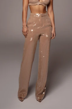 The glamour never stops when it comes to our Tan Elowen Sequin Trousers! These beautiful straight leg trousers are featured in sequin fabric with a high waist, inseam pockets, and a front zipper with clasp closure. Tan chiffon interior lining adds a soft touch. Pair with the
