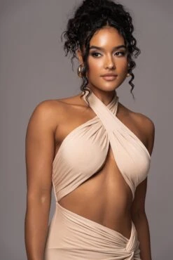 Channel the goddess within in our Tan Tamara Halter Midi Dress. Our newest addition boasts a captivating crossover halter design, complimented by a waist cutout and a striking side slit featuring a knotted detail for added flair. Expertly crafted from soft, double-lined fabric with stretch for a flexible fit. Stretchy. Double lined.