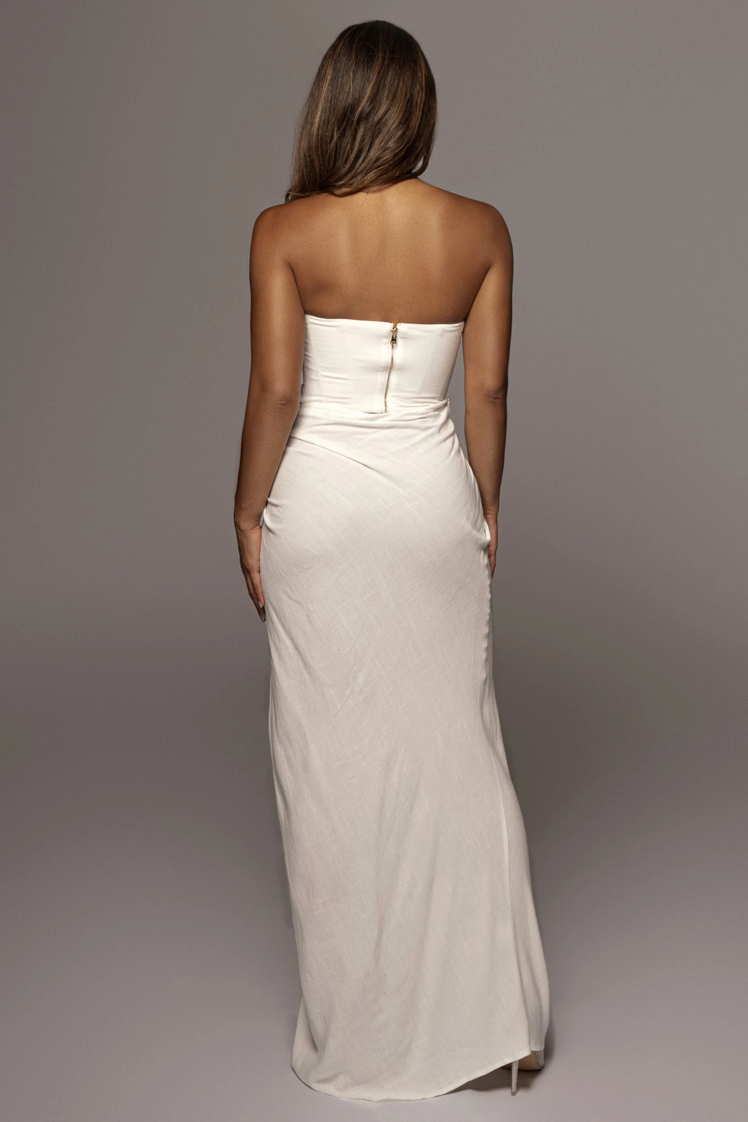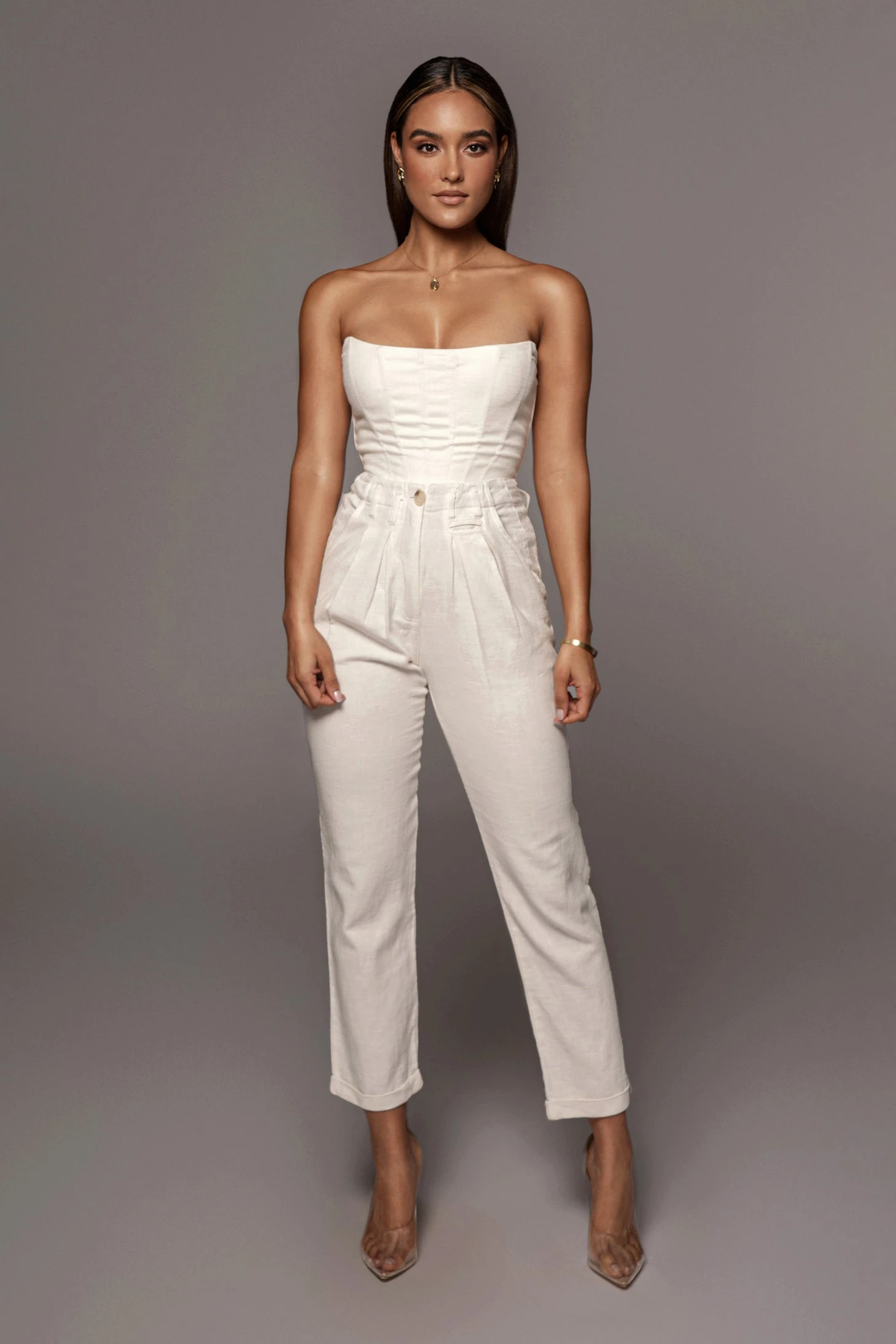 You’ll be the epitome of style when wearing our Ivory Fenix Reversible Linen Corset. This eye catching corset showcases a strapless neckline with boning throughout the front and back for added structure and support. Crafted in a Cotton/Linen blend, this corset top is designed with a reversible feature consisting of a flattering front with boning detail and the other with a solid bodice for a smoother look. Complete with an elastic back for flexible fitting. Gold tone zipper closure. Stretchy.Â