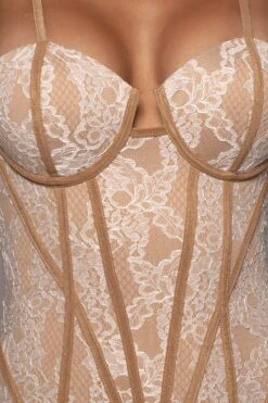Lovely in lace with our White Katerina Lace Dress. This gorgeous curve-hugging dress features a sweetheart neckline with a bustier style bodice, and a back slit at the lower hem. Stunning piping detail throughout elevates the glamour of this midi length dress, complete with adjustable shoulder straps and back zipper for closure. Gold tone accents. Lined interior. Some stretch.